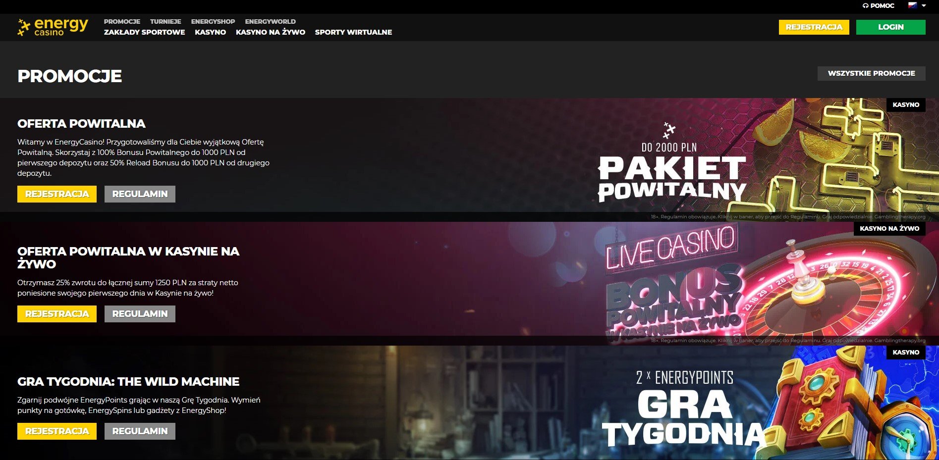 - Oferta powitalna – w Energy Casino bonus ten podzielony jest na 2 części. W ramach pierwszej wpłaty otrzymujemy 100% bonus do kwoty 1000 PLN. Druga wpłata to 50% reload bonus do 1000 PLN.