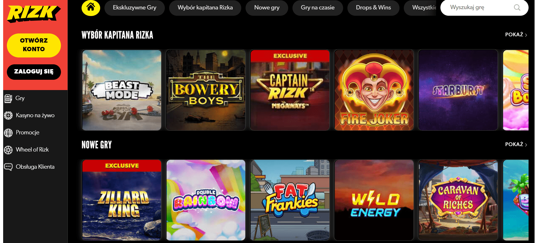 - Wybór kapitana Rizka – czyli polecane przez kasyno tytuły, jak na przykład The Bowery Boys lub Starburst.