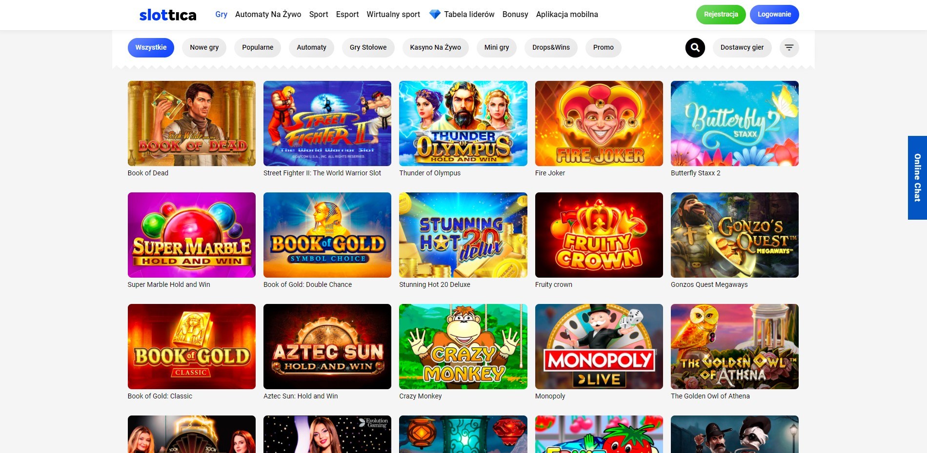 - Slotów do gry, czyli cyfrowych odpowiedników jednorękich bandytów. Slottica sloty to między innymi takie przeboje jak Gonzo’s Quest, Book of Dead, Fire Joker, Starburst, Wolf Gold, czy Demi Gods 2.